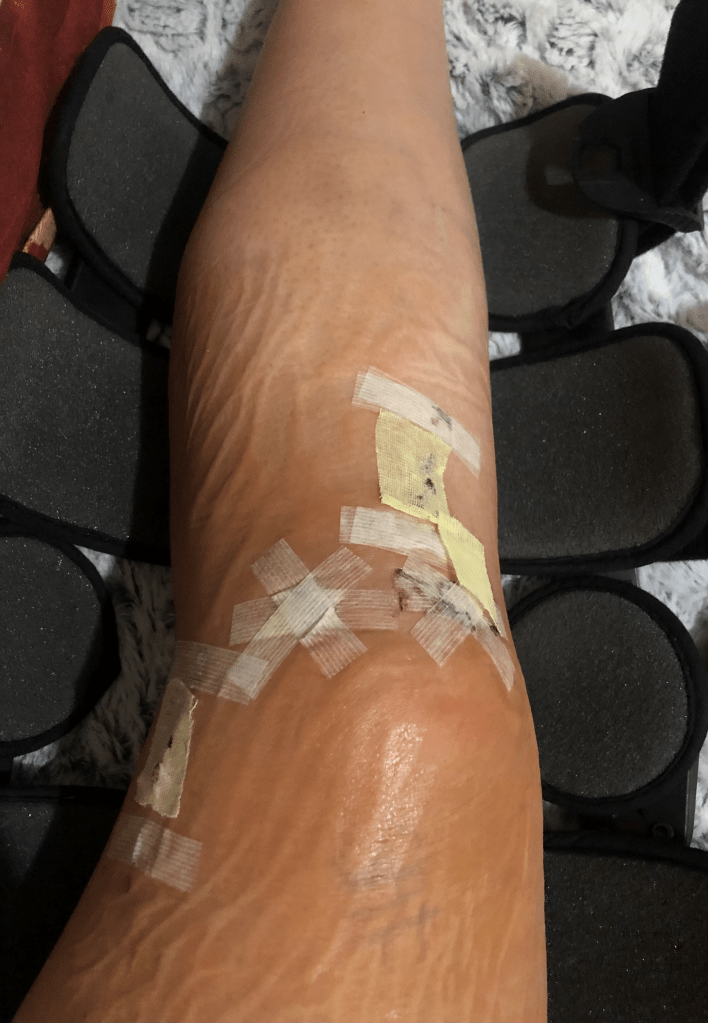 Speaking of elevating, the post-op instructions outlined to ice and elevate whenever possible. At first I even slept with my leg slightly elevated, locked in the brace, but my leg was so heavy with the swelling it made it very uncomfortable. I double-checked with the Dr.’s office, who gave the OK to sleep with the leg flat, and that helped, but sleep was still hard. Whether from the anesthesia, or a new environment, my sleep pattern was off for the first week or two. I would be exhausted by 9pm, but then wake up wide awake at 2am. I was very lucky that I wasn’t in a lot of pain the days following. I took one or two of the prescribed painkillers and that was it! I think if I had had a autograft, I would have needed the painkillers more, since you’re healing from two open wounds. Even still, I was scared to take the dressing off after 3 days, per instructions, to see what I would find. It turned out to be not that bad, even for someone as squeamish as myself. The PT clinic covered up the open wounds with clear bandages and a new Ace wrap until my first post-op Dr. visit.