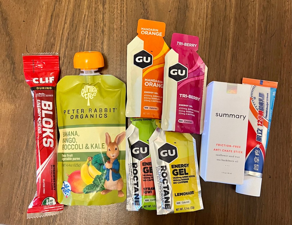 Clif Bloks, Baby Food, Gu with Caffeine, Anti-Chafe stick, and Asian version of Ben-Gay